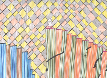 Lady pointing up while one eyed creates pass by